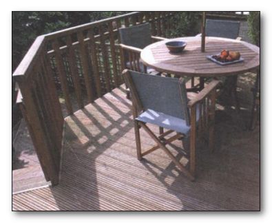 Кроме перголы, надо обдумать балюстраду или простые перила. Разумеется, если настил построен на возвышении, они абсолютно необходимы и должны быть высотой не меньше 1,2 метра, а балясины должны стоять достаточно часто, чтобы между ними не могли протиснуться дети. Однако о перилах стоит подумать и в случае, если ваш настил находится на уровне земли. Они могут стать дополнительным декоративным элементом, а кроме того, организуют вертикальное пространство, что важно, если ваш настил большой, плоский и построен на одном уровне.
