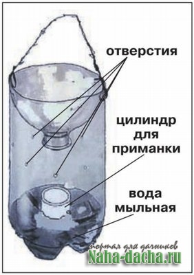 (см. рис.). На дне ловушки закрепляется клеем или подплавкой футляр-цилиндр от фотопленки или любой пластиковый цилиндр высотой 5-6 см. В ловушку наливают мыльную воду, так чтобы ее уровень на 2 см не достигал верха цилиндра и она не касалась приманки. В качестве приманки в цилиндр кладут мясо, рыбу или баночный кошачий корм (причем в разных регионах у ос разные предпочтения). Оса, залетев в ловушку через воронку и взяв приманку, при взлете падает в воду. Мыло снижает коэффициент поверхностного натяжения воды, осы не держатся на ее поверхности и тонут. Отверстия сбоку нужны, чтобы воздух внутри ловушки не застаивался. И не забывайте удалять ос и менять приманку.