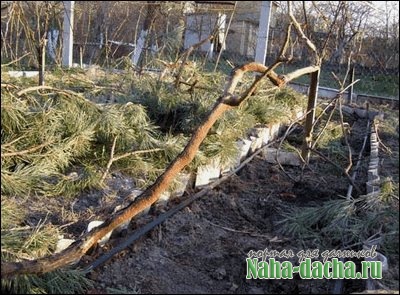 Первые два года виноград в конце октября опускала на землю, подкладывая под лозу чурки от дров, и прикрывала лапником сверху. А потом он рос и отлично зимовал без укрытия.