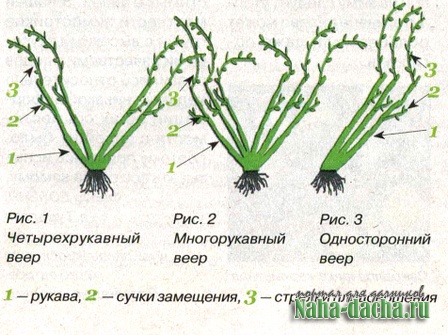 У полных вееров — четырехрукавного и многорукавного — весной при сухой подвязке рукава к шпалере закрепляют в равном количестве направо и налево. Кусты приобретают вид развернутого веера.