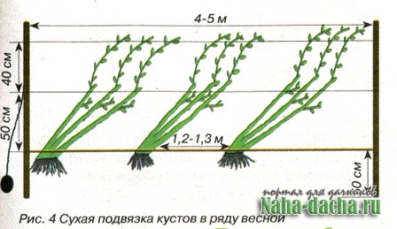 рис. 4 все кусты в ряду имеют наклон вправо. Для шпалеры использованы металлические трубы и оцинкованная проволока толщиной 2-3 мм. Расстояние между столбами — 4-5 м. Столбы вкопаны в грунт на 0,5 м. Первая проволока шпалеры натянута на высоте 50 см, следующие — через 40 см. На концах ряда нижняя проволока выведена за столбы. К ней прикреплен якорь из камня. Якоря вкопаны в землю на 30-40 см. Они придают шпалере устойчивость при сильных ветрах.