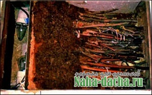 Для этого беру деревянный или фанерный ящик размерами 50x40x20 см. Устанавливаю в нем перегородку из любого металла (стальную, медную, алюминиевую) на расстоянии 10 см от края - это так называемая камера нагрева. Источник нагрева - 2 лампочки по 60 Вт, включенные последовательно, чтобы не перегорали. С другой стороны перегородки устанавливаю по центру датчик температуры. Черенки укладываю «пятками» на расстоянии 5 см от перегородки и тщательно послойно пересыпаю влажными, предварительно пропаренными опилками -примерно на 10 см черенка. Остальная его часть должна быть в холоде.