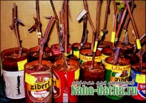 Первый осмотр и выборку делаю на 18-й день. В это время уже есть черенки с корешками размером 10-20 мм. Второй осмотр и выборку делаю на 20-й день. Окончательную выборку делаю на 22-й день. Главное, необходимо следить за размерами корешков. Оптимальный размер 20-30 мм. Сажаю черенки в горшки, нарезанные из ПЭТ-бутылок, и заношу в комнату, где при температуре 20-22° глазки трогаются в рост.